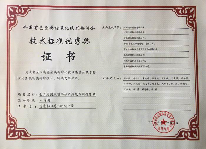 與此同時,我公司獲得由全國有(yǒu)色金屬標(biāo)準化技術委員會頒發的“技術標準優秀獎(一等獎)”。