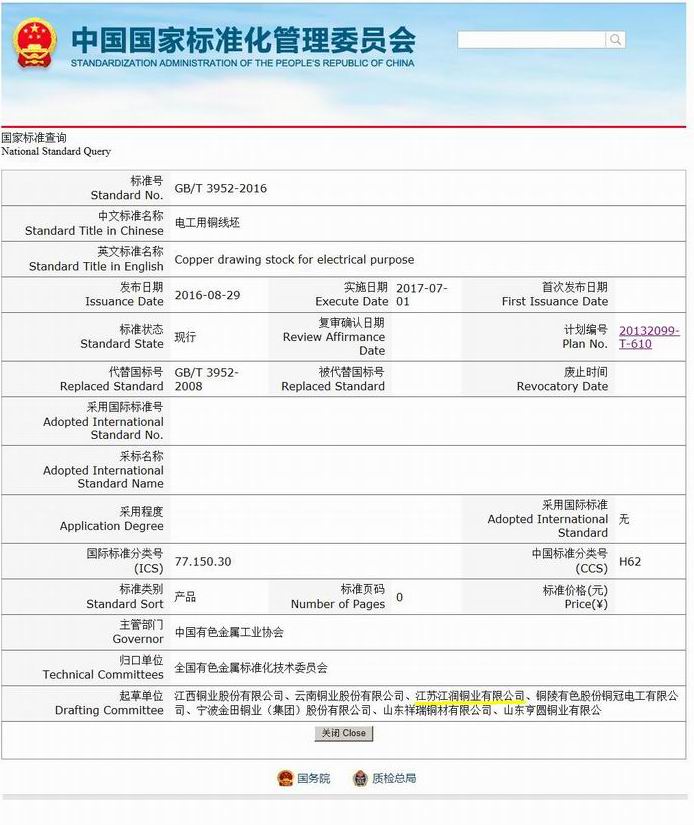 近日國家質檢總局、國家標準委公布了由國家質量監督檢驗(yàn)檢疫總局、國家標準化管理委(wěi)員會批準的國(guó)家標準《電工用銅線坯(pī)》(GB/T 3952-2016),替代現行的《電工用銅線坯》(GB/T 3952-2008),新標準將於2017年7月1日正式實施。