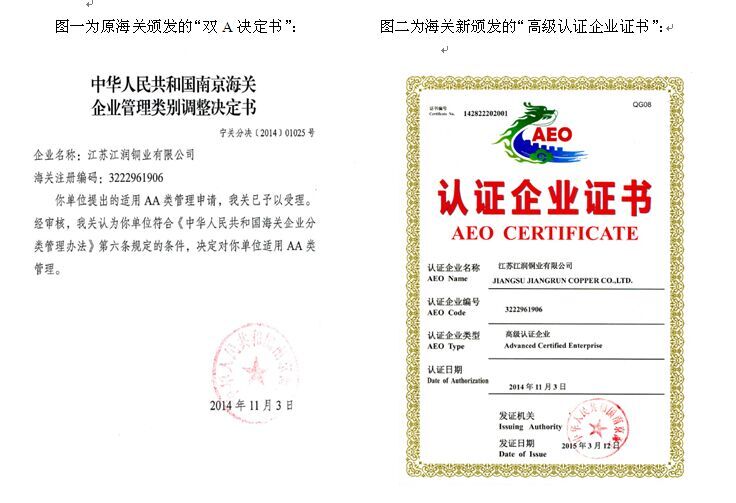 2015年7月30日,由無錫關檢貿(mào)組織的“共創共建”啟動(dòng)儀式在無錫隆(lóng)重舉(jǔ)行,參會企業共十五家(jiā)。會(huì)議議程為原無錫市15家海關AA類管理的企業直接過渡為海關高級認證企(qǐ)業。江蘇黄片入口銅業有限公司榮獲由南京海關頒發的“高級認(rèn)證(zhèng)企業”的稱號,公司總經理駱偉棟參會並領獎(jiǎng)。《中華人民共和國海關企(qǐ)業信用管理(lǐ)暫行辦法》去年12月1日實施後,海關注冊企業的管理類別從原來的AA、A、B、C、D類劃分,改為按企(qǐ)業信用(yòng)狀況劃分為(wéi)認證企業、一般信用企業(yè)和失(shī)信企業,其中認證企(qǐ)業(yè)又分為一般認證企業和高級認證企業。認證(zhèng)企業在通關時適用較低的貨物查驗(yàn)率,單證審核程序相對簡化,並可以優先辦(bàn)理海關通關手續。 高級認證企業,除享有一般認證企業的通關便利外,其進出口貨物在確定商品歸類、原產地確定、海關估價和辦結其他海關手續前可先行驗放,由海關統一設立協調員,提供便捷通關服務。走出國門(mén)後,高級認證企業更(gèng)可享受與中國實現AEO互認國家或地區海關提供的通關便利,這相當於直接獲得一張在全球有關國家或地區快速通關的VIP卡。